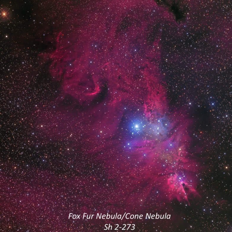 5) The Fox Fur Nebula surrounding the Christmas Tree Cluster (NGC 2264) is an amazing region at 1x. The irregular shaped glow extends ~3° in diameter and more including a partial outer loop around the south and east periphery. Two large fainter arcs (forming the Monoceros Loop Supernova) are attached at the southeast and southwest sides. They extend at least 3° south and connect to the ultra-high surface brightness Rosette Nebula.