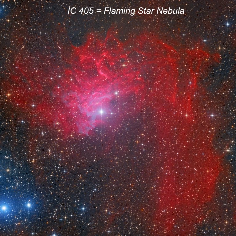 4) The Flaming Star Nebula (IC 405) is a fairly prominent glow (1.1° x 0.8’) close NE of 3 colllinear mag 4.5-5.5 stars (all are pairs in binoculars). The shape was very irregular. A large faint strip is attached on the NW end and extends due south on the west side (this is Simeis 126) to within ~20’ of 5th magnitude 14 Aur. The Tadpole Nebula (IC 410), which is smaller, is symmetrically placed on the SW side of the three naked-eye stars and is also a bright glow about 40’ in size.