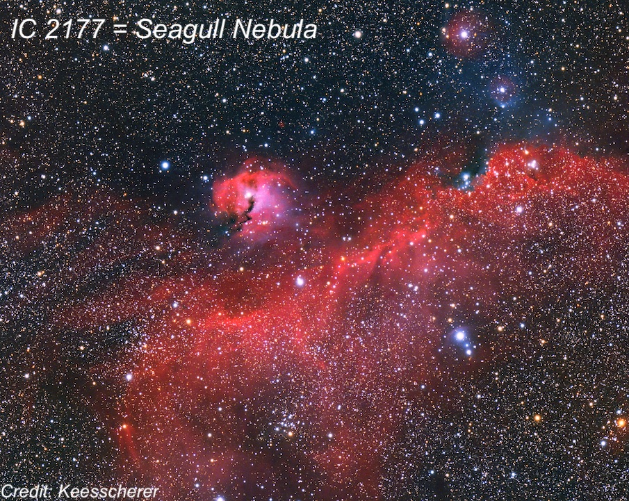 3) The Seagull Nebula (IC 2177) is another prominent 1x night-vision target to the north of Gamma CMa and east of Theta CMa. It extends mainly N-S and is slightly curved in a relatively narrow outline for nearly 2.5°. Besides the main section, a very large, lower surface brightness region extends to the east from the upper ~1/3 of the main strip.