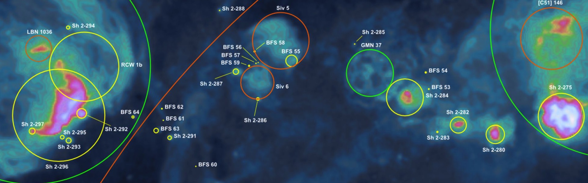 6) From the Rosette Nebula (NGC 2237) to Sivan 5, a string of three fainter puffs of nebulosity (Sh 2-280, 2-282, and 2-284) extends southeast. Continuing in the same direction (southeast) for ~5°, leads to a very large fainter glow (Sivan 5), which is ~1.5° in diameter. The total length from the Rosette to Sivan 5 is about 10°!