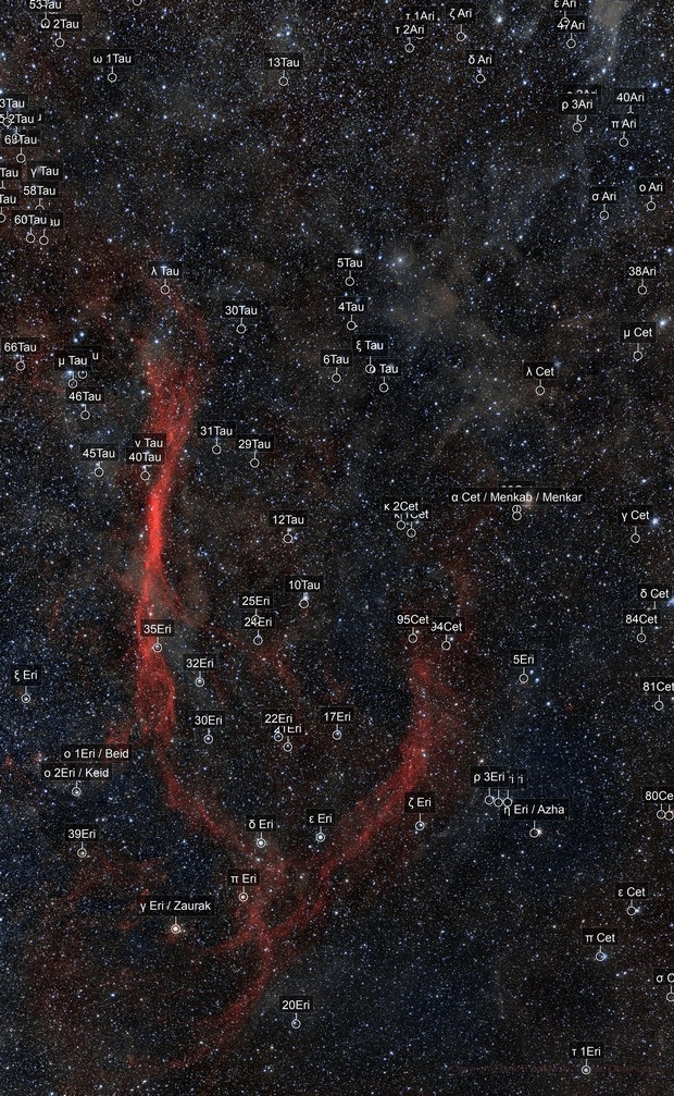 10) The Eridanus Loop (Sh 2-245) is a fainter, but also fantastically large loop on the west side of Orion. The brighter eastern of this ginormous Loop (part of the Orion-Eridanus Supershell) begins a couple of degrees north of mag 3.9 Nu Eridani. It extends due south in a faint, narrow strip for 16° to 20° in length! The brightest strip (which was immediately seen) is directly south of Nu Eri and I’ve observed this section visually from Willow Springs. The southern half of this strip is somewhat fainter, but still was easily seen. It appears to curve west at the S end towards mag 3.5 Delta Eridani, but loses its coherent structure. I wasn’t able to confidently trace the western part of the loop as it curves north.