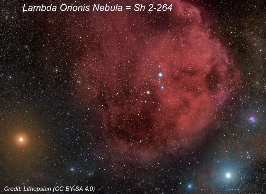 8) Lambda Orionis (Meissa) Nebula = Sh 2-264 is a huge, circular glow (about 5° across) centered on Meissa, the star that marks Orion’s head. It’s also a prominent object in night vision, comparable to Barnard’s Loop, with a well defined circular outline but no structure.