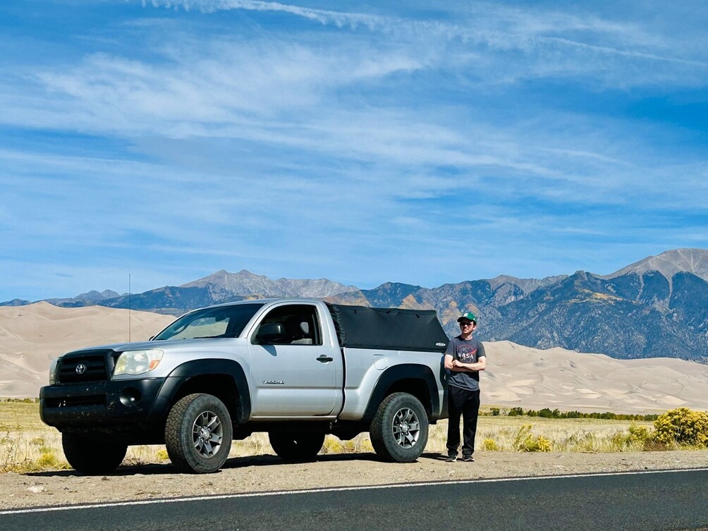It had been two epic days of remote solo camping, and I was looking forward to familiar faces. Two hours of gorgeous desert roads were all that it took to finally arrive in Colorado, and I sat waiting at a set of coordinates south of Great Sand Dunes National Park in public BLM land. The San Luis Valley had immediately captivated me on my drive in. This vast and arid plain was surrounded by impressive towering peaks on all sides. It was incredibly beautiful. After a quick nap, I saw a pumpkin orange Tacoma coming down the dirt road. My dad, uncle, and his girlfriend had found me!