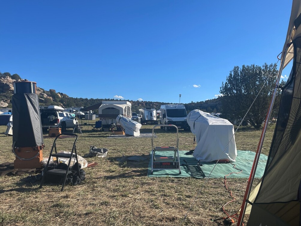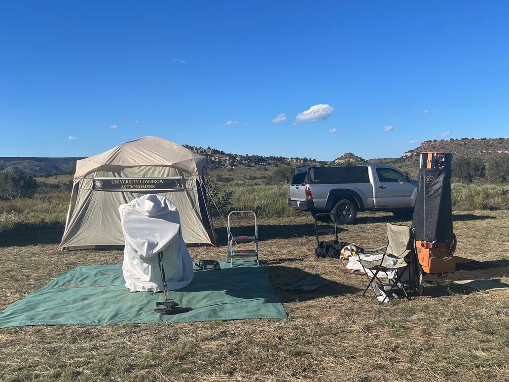I had made it to my first star party, and I was immediately met with a magical sight. The rocky cliff faces of Black Mesa towered over the observing field on all sides. As the late afternoon lighting shifted, the sun cast new reflections and shadows between the rocks. It was a truly unique biome, featuring cacti, desert wildflowers, and familiar grasslands. Recent rainfall had left the field dust-free and the vegetation green. Looking around, my 15” Obsession was in good company. Our club was on the southern row of a massive observing field, and nearly all of the surrounding campers had large Dobsonians parked along their rows.