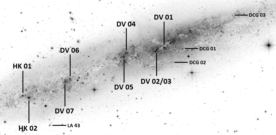 Finder chart for objects in NGC 55 by Scott Harrington. Original photo by Mark Hanson.