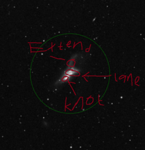 Here’s an annotated image that shows the knot, lane, and outer structure. I was pretty skeptical about the crossing lane, but it was there with averted vision and careful study over the course of the hour at 330x.